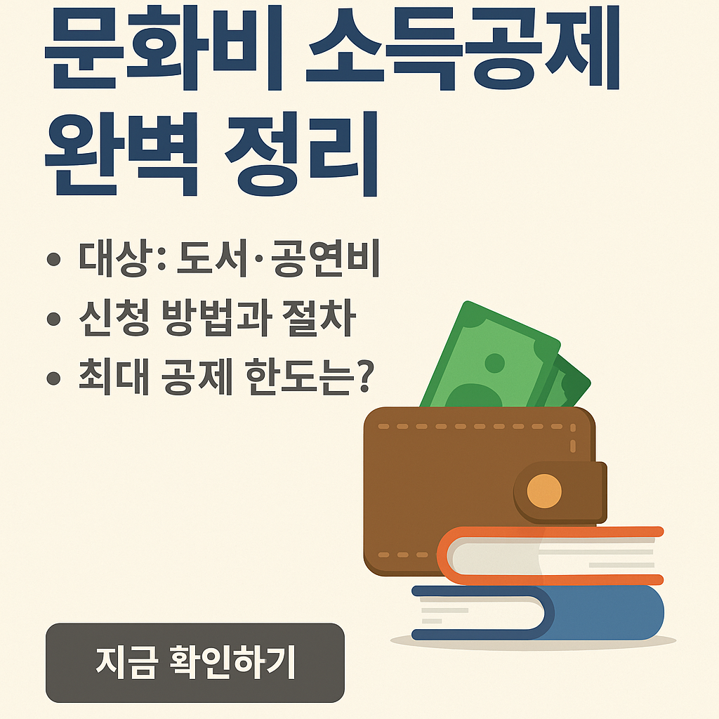 문화비 소득공제 완벽 정리: 대상·방법·최대 혜택 총정리1. 문화비 소득공제란?문화비 소득공제는 도서·공연·박물관·미술관 등의 지출에 대해 일정 금액을 소득에서 공제해주는 제도입니다. 근로소득자 중 총급여 7,000만 원 이하인 경우 적용되며, 책 구매, 공연 관람 등 문화생활에 대한 소비를 장려하기 위해 도입됐습니다.신용카드 소득공제 한도 내에서 추가로 100만 원까지 문화비 항목이 공제되며, 특히 청년층과 자녀가 있는 가정에서 유리한 혜택입니다.2. 공제 대상자 요건총급여 7,000만 원 이하 근로자신용카드 등 사용액이 총급여의 25% 초과 시 적용도서, 공연, 박물관·미술관 입장권 구매 실적 필요3. 공제 대상 항목 (꼭 확인!)도서 구매: 오프라인 서점, 온라인 서점 모두 포함 (단, 실물 도서)..